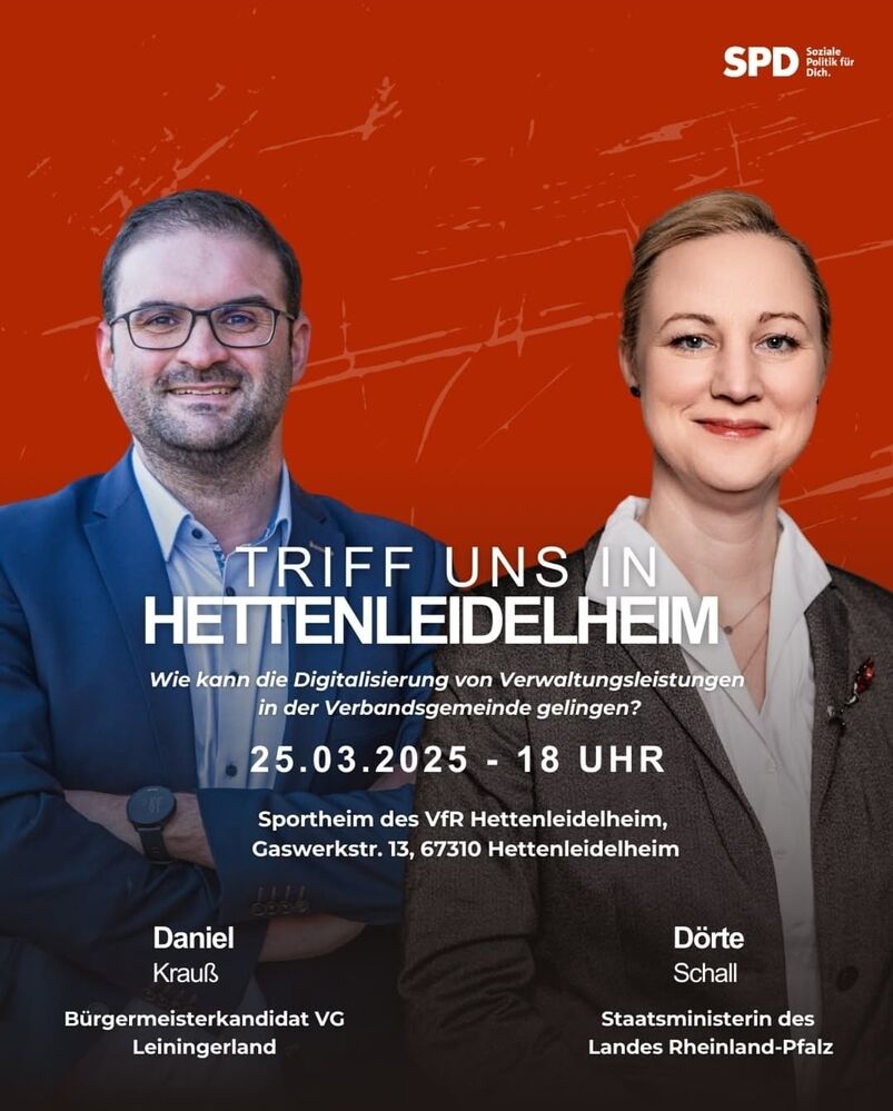 Am 25.03.2025 ab 18:00 Uhr kommt Daniel Krauß (Verbandsgemeindebürgermeisterkandidat VG LL) zusammen mit Dörte Schall (Staatsministerin des Landes RLP) zu Besuch.
